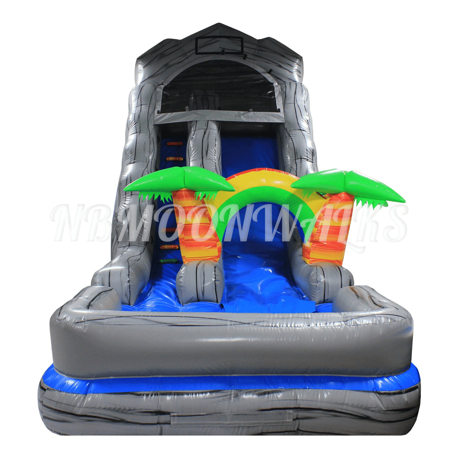 Enter the Gray Marble Water Slide by climbing up the steps, which will have handles going up for easy climbing. Riders will sit and slide down from 10 feet into an inflated pool. This ensures the Gray Marble Water Slide ride is safe to use with or without water. The pool has drains and flaps to easily remove water after each use.