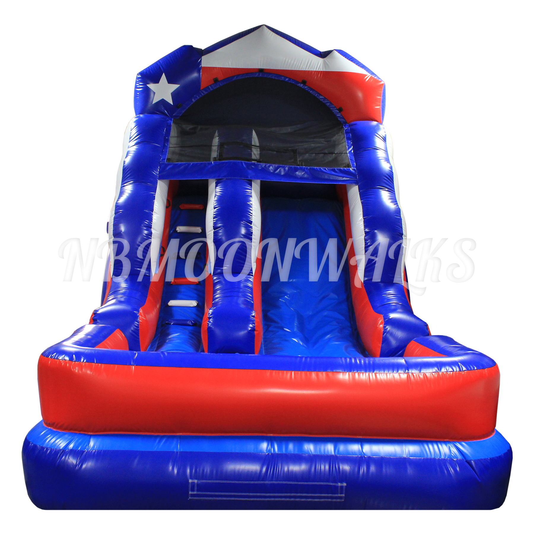 Each USA Water Slide features steps with handles up the slide for easy climbing. Riders will slide down from 10 feet into an inflated pool. This ensures the ride is safe to use with or without water. The pool has drains and flaps to easily remove water after each use.