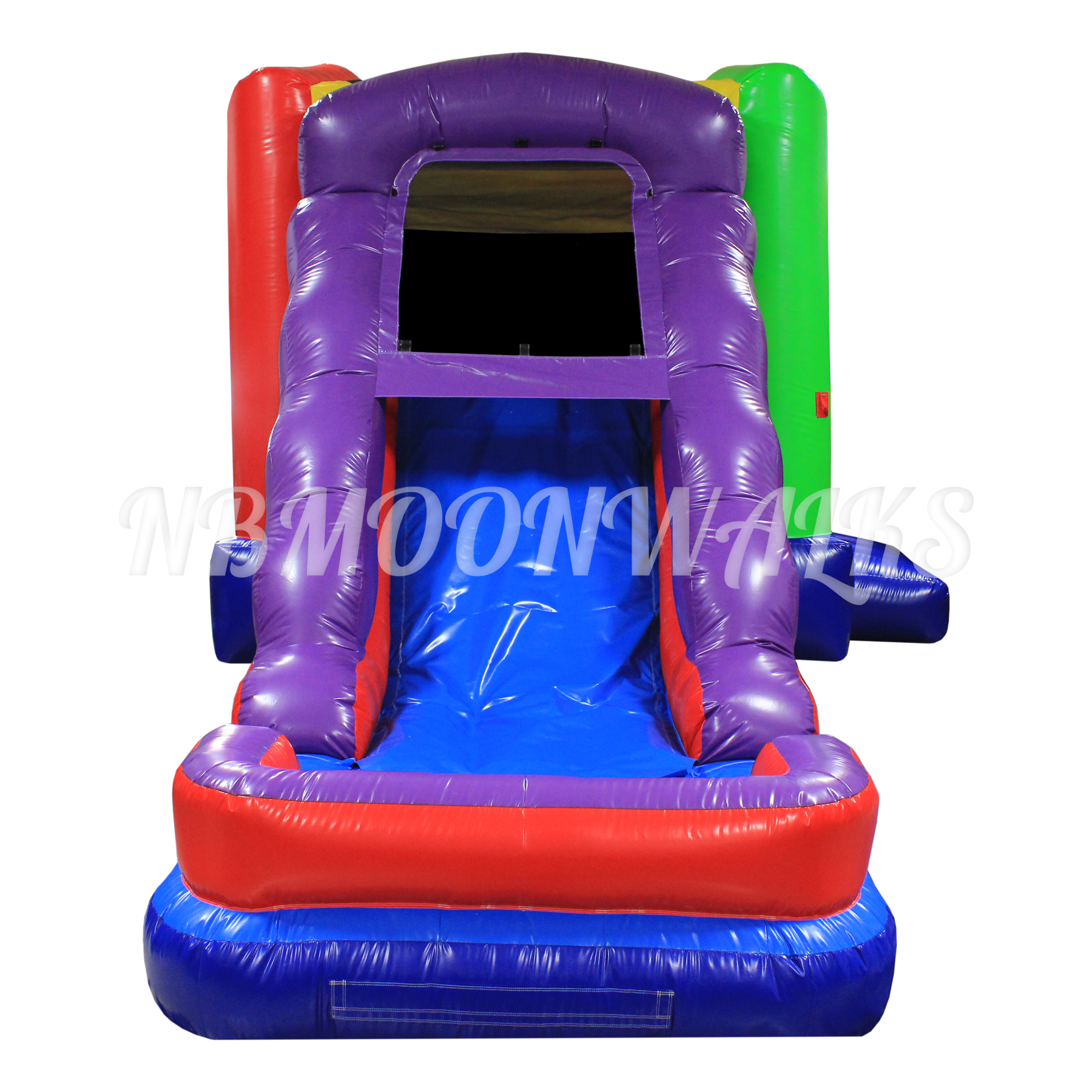 Entering the Funhouse Combo, you will find a clear bouncing area with one hoop inside. The roof has a velcro exit for emergencies. Off to the side, steps lead up to a single-lane slide. Handles are added along the sides for an easy climb up. Riders will slide down the Funhouse Combo slide into an inflated pool. The inflated pool ensures that riders may safely slide down, whether the pool is being used with or without water. The pool has drains and flaps to remove water after use.