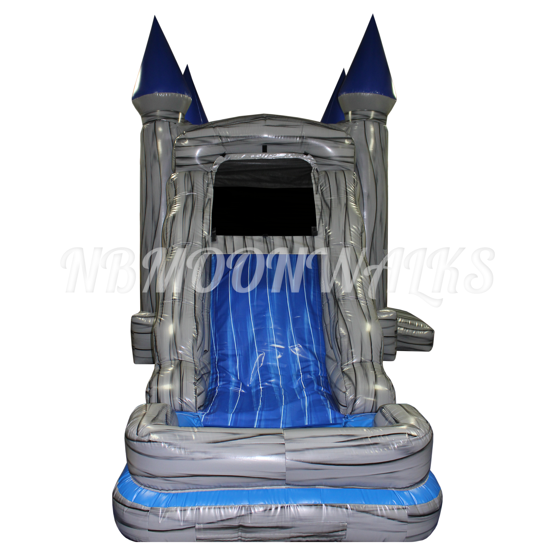 Entering the Gray Marble Castle Combo, you will find a clear bouncing area with one hoop inside. The roof has a velcro exit for emergencies. Off to the side, steps lead up to a single-lane slide. Handles are added along the sides for an easy climb up. Riders will slide down the Gray Marble Castle Combo slide into an inflated pool. The inflated pool ensures that riders may safely slide down, whether the pool is being used with or without water. The pool has drains and flaps to remove water after use.