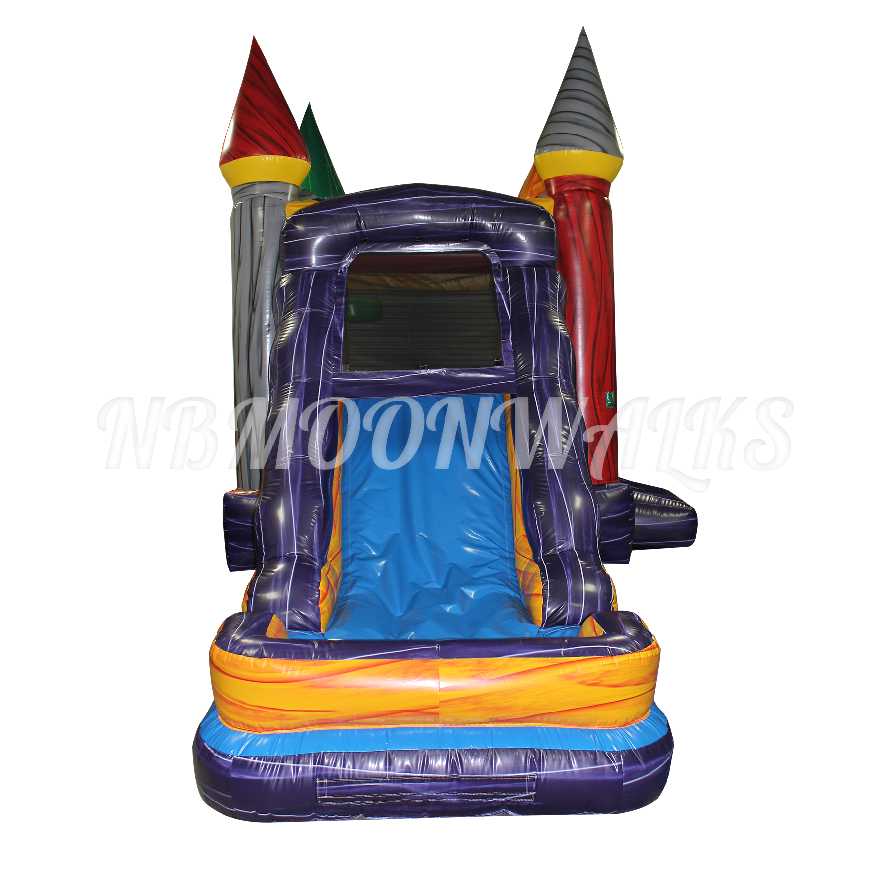 Entering the Marble Funhouse Castle Combo, you will find a clear bouncing area with one hoop inside. The roof has a velcro exit for emergencies. Off to the side, steps lead up to a single-lane slide. Handles are added along the sides for an easy climb up. Riders will slide down the Marble Funhouse Castle Combo slide into an inflated pool. The inflated pool ensures that riders may safely slide down, whether the pool is being used with or without water. The pool has drains and flaps to remove water after use.
