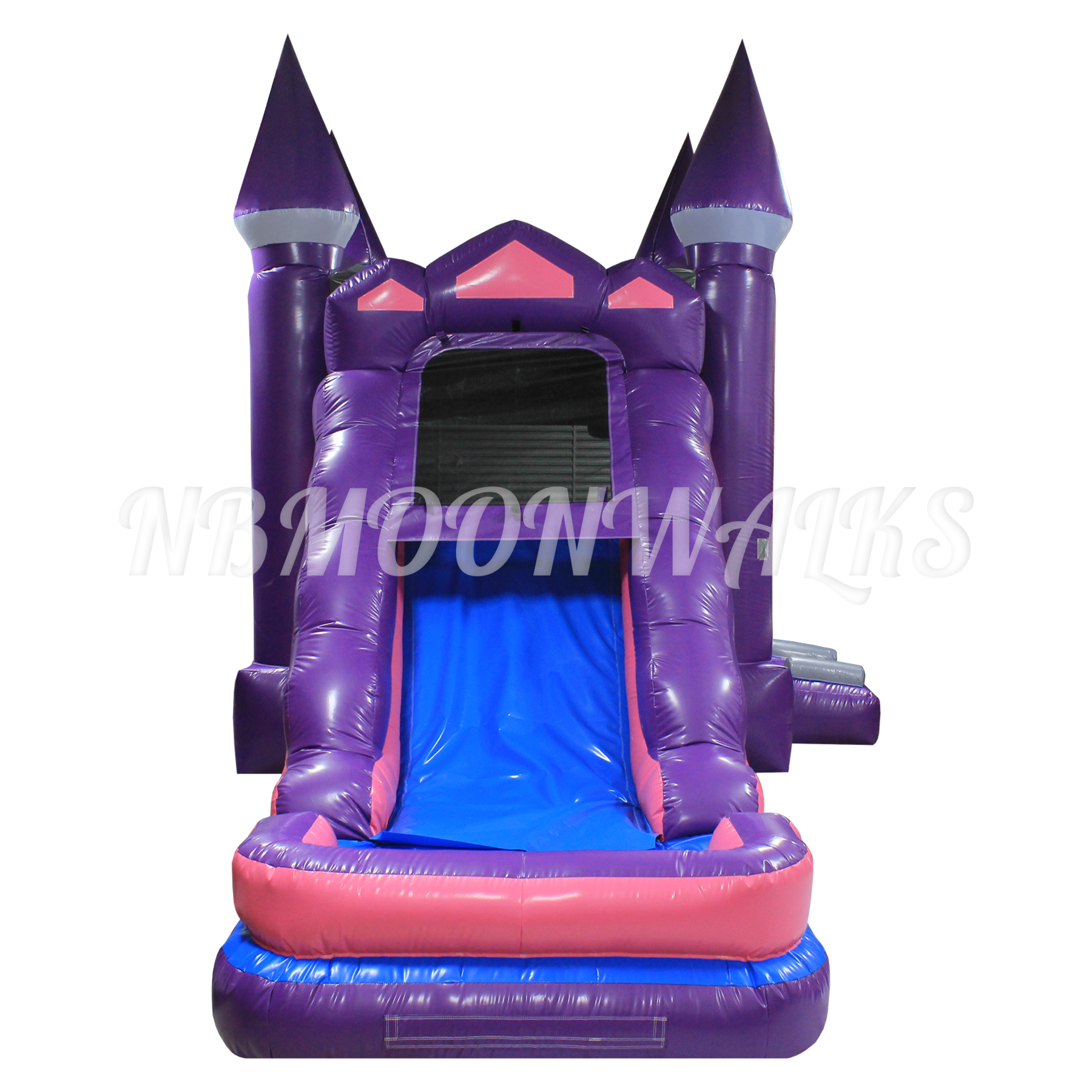 Entering the Princess Castle Combo, you will find a clear bouncing area with one hoop inside. The roof has a velcro exit for emergencies. Off to the side, steps lead up to a single-lane slide. Handles are added along the sides for an easy climb up. Riders will slide down the Princess Castle Combo slide into an inflated pool. The inflated pool ensures that riders may safely slide down, whether the pool is being used with or without water. The pool has drains and flaps to remove water after use.