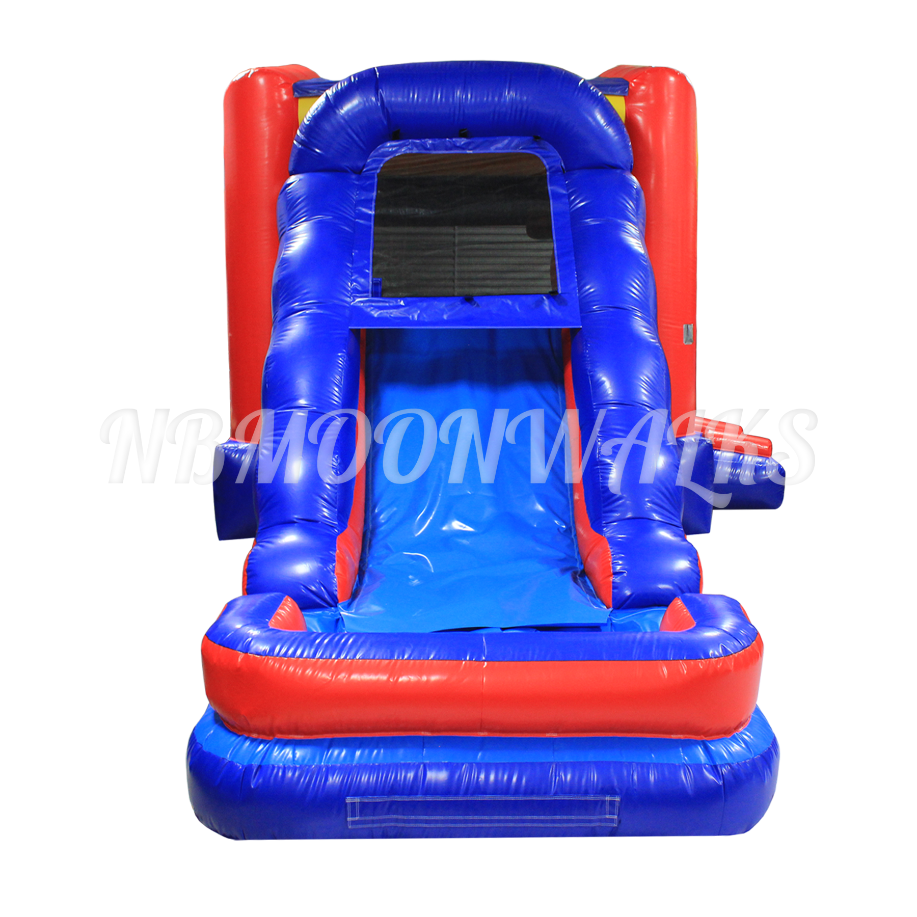 Entering the Module Combo, you will find a clear bouncing area with one hoop inside. The roof has a velcro exit for emergencies. Off to the side, steps lead up to a single-lane slide. Handles are added along the sides for an easy climb up. Riders will slide down the Module Combo slide into an inflated pool. The inflated pool ensures that riders may safely slide down, whether the pool is being used with or without water. The pool has drains and flaps to remove water after use.