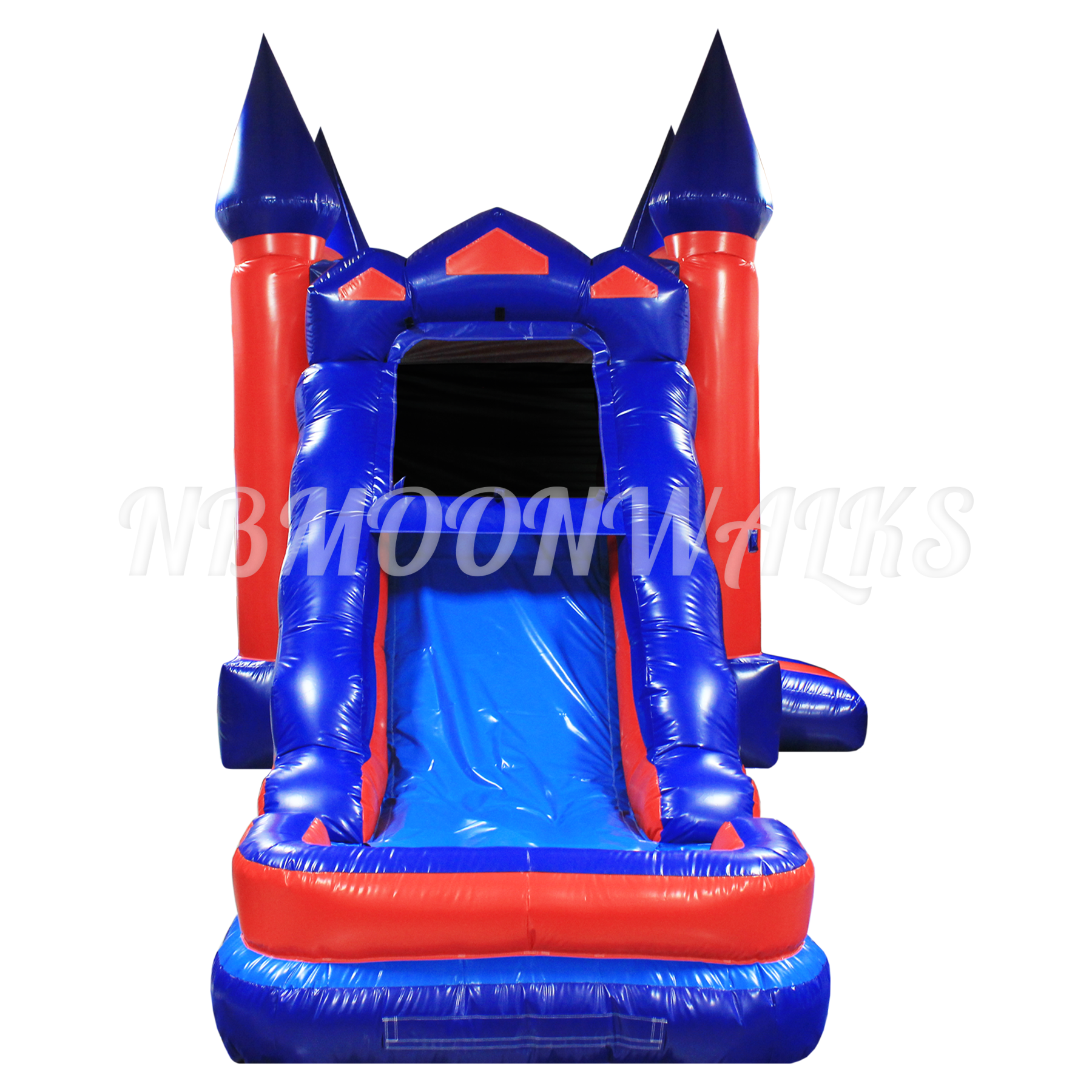 Entering the Red & Blue Castle Combo, you will find a clear bouncing area with one hoop inside. The roof has a velcro exit for emergencies. Off to the side, steps lead up to a single-lane slide. Handles are added along the sides for an easy climb up. Riders will slide down the Red & Blue Castle Combo slide into an inflated pool. The inflated pool ensures that riders may safely slide down, whether the pool is being used with or without water. The pool has drains and flaps to remove water after use.