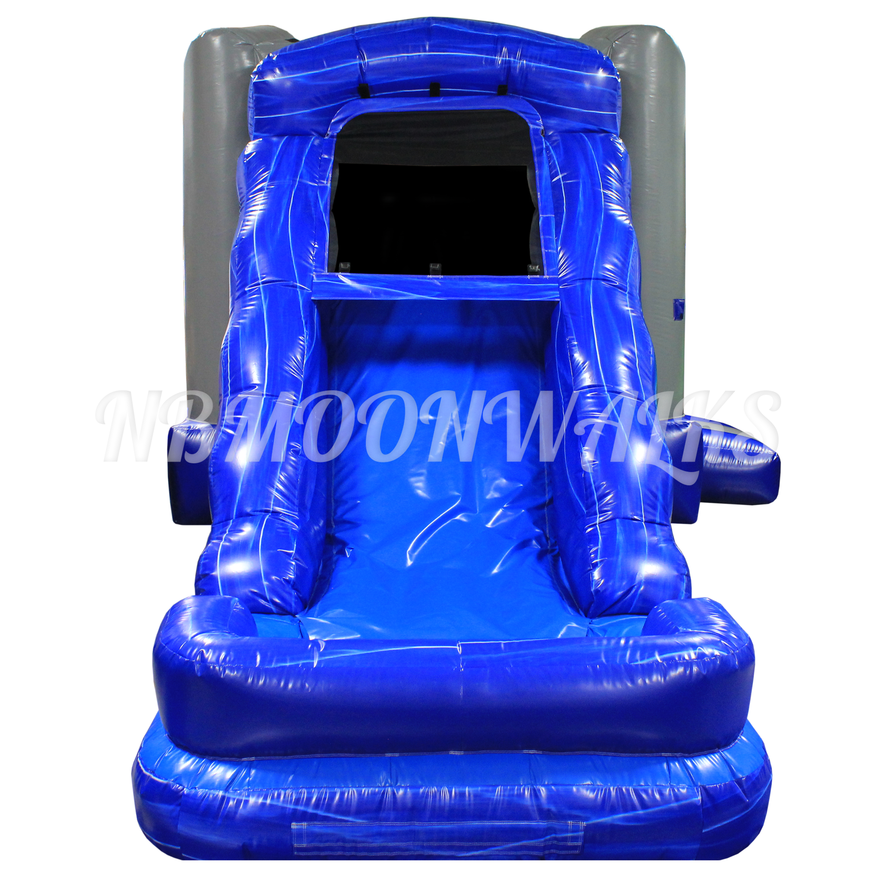 Entering the Blue Marble Combo, you will find a clear bouncing area with one hoop inside. The roof has a velcro exit for emergencies. Off to the side, steps lead up to a single-lane slide. Handles are added along the sides for an easy climb up. Riders will slide down the Blue Marble Combo slide into an inflated pool. The inflated pool ensures that riders may safely slide down, whether the pool is being used with or without water. The pool has drains and flaps to remove water after use.