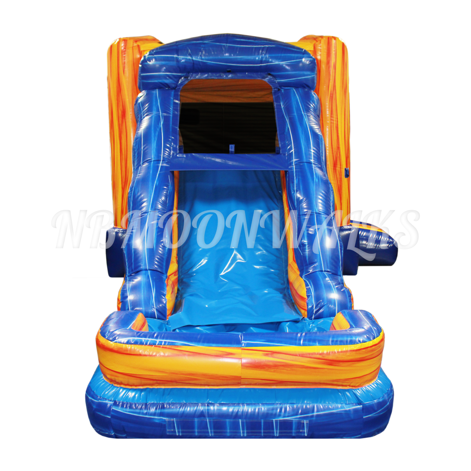 Entering the Module Combo, you will find a clear bouncing area with one hoop inside. The roof has a velcro exit for emergencies. Off to the side, steps lead up to a single-lane slide. Handles are added along the sides for an easy climb up. Riders will slide down the Module Combo slide into an inflated pool. The inflated pool ensures that riders may safely slide down, whether the pool is being used with or without water. The pool has drains and flaps to remove water after use.